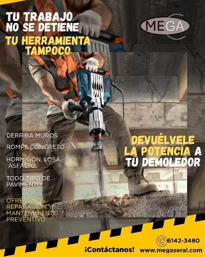 Reparamos desde Rotomartillo, demoledores, amoladores, hidrolavadoras, cortadoras de pavimento, motosoldadoras, vibrador de concreto, generadores, trompos, taladros, rolas hasta allanadoras.